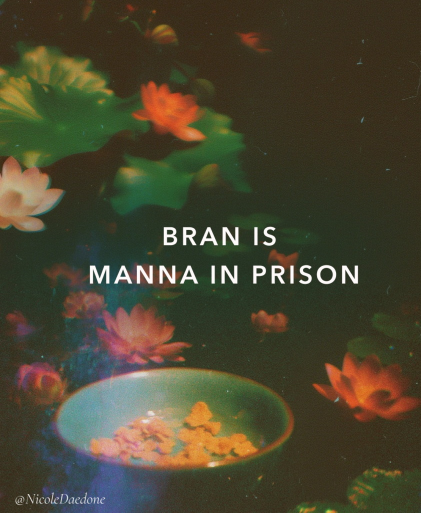 Bran is manna in prison. Neutral-to-good taste, recognizable as food, and the medicine that keeps you regular. If you’re not vigilant, the whole experience can be one big bloat—stagnation.