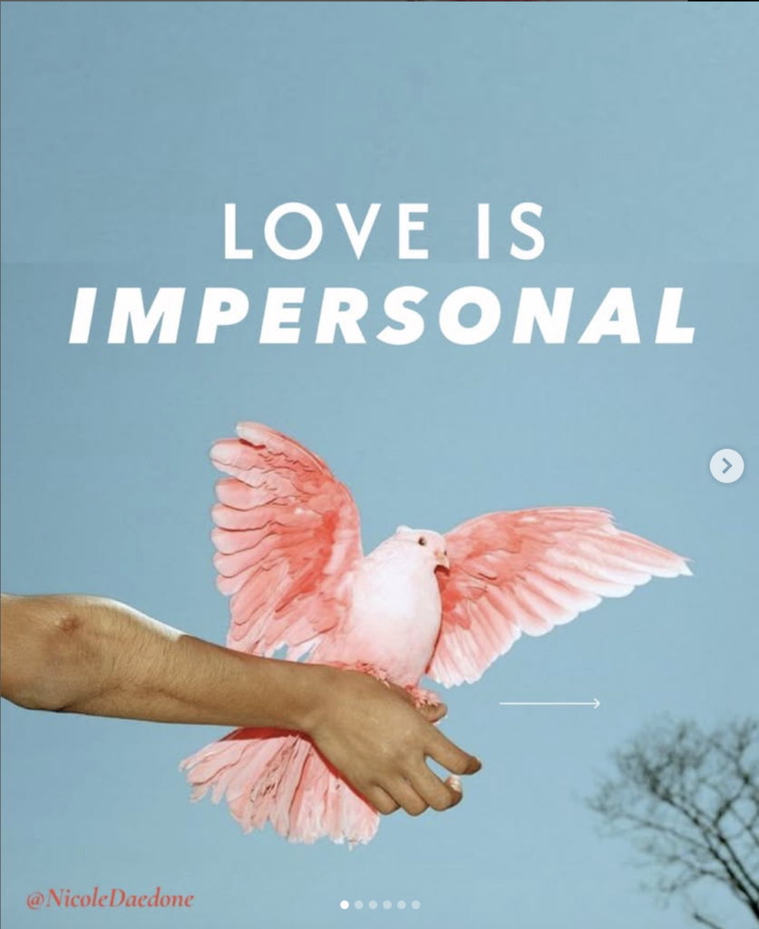 Unless we are connected to an impersonal love, we will make all love, or lack of love, personal. The most generous thing we can do is love through people to God. When we do this, that conduit comes through them and the beyond-human pressure is taken off them. We then have the levity of consciousness this prospect affords us. All needs have been met; the other person does not need to be saddled with our needs.